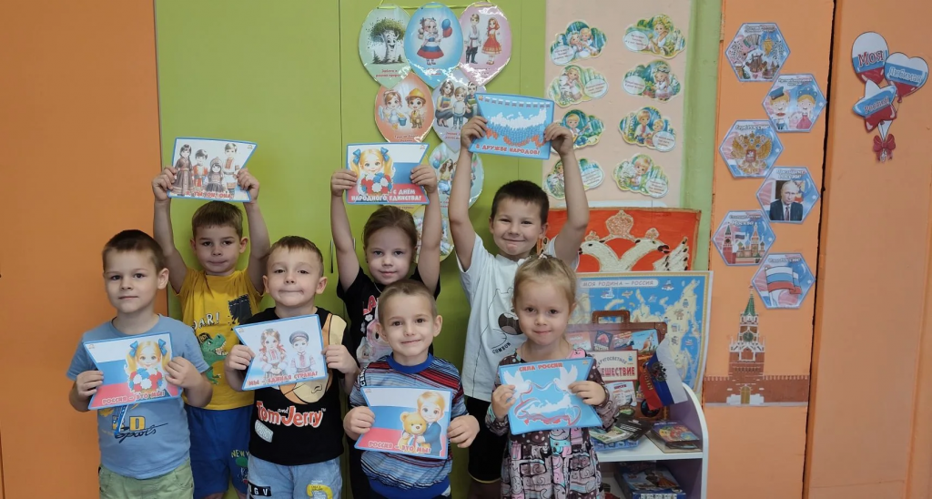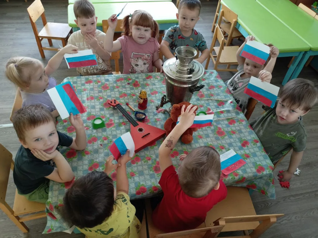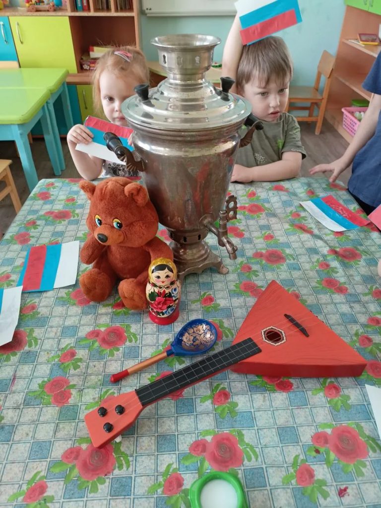 🇷🇺 Так, в группе «Смешарики» малыши с большим интересом познакомились с традиционными символами нашей страны: послушали музыку на балалайке, поиграли с деревянными расписными ложками, узнали о медведе и самоваре – неофициальных символах России, а также увидели и примерили на себя национальные русские костюмы. Затем дети вместе сделали красочный флаг нашей страны!